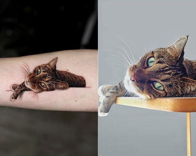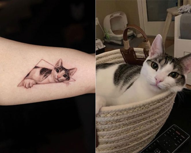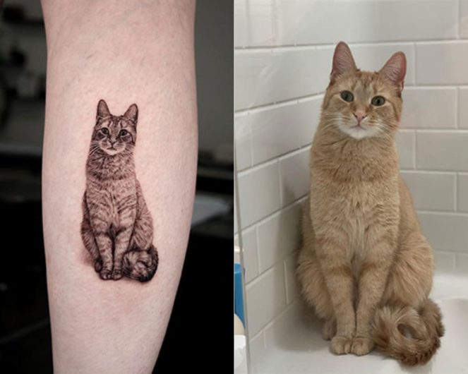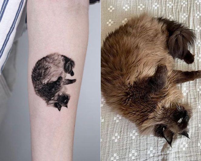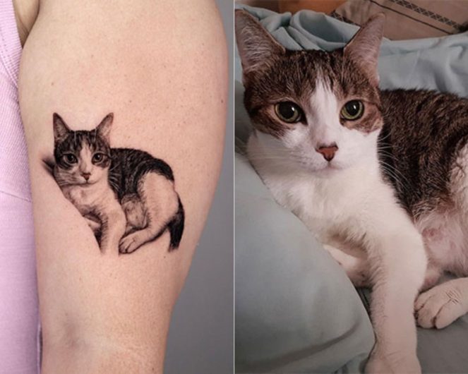 The real cat’s relaxed pose and soft fur capture the essence of a pampered pet, making this tattoo a beautiful tribute.