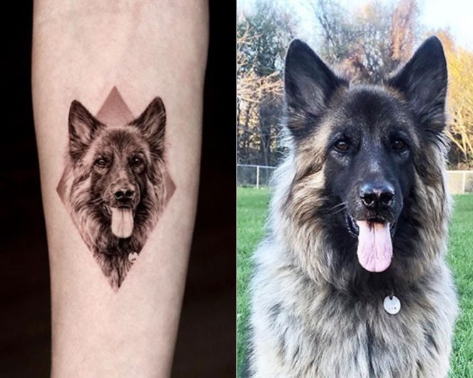 The details in the fur and the joyful expression make this tattoo a real tribute to the dog’s personality.