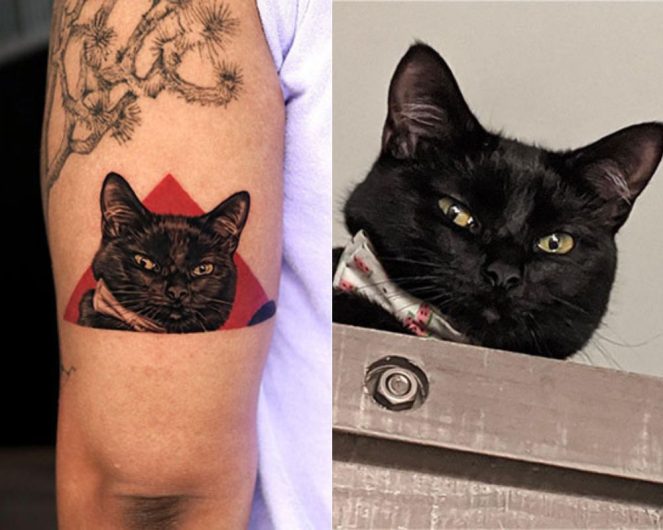 In this tattoo, the artist captures the cat’s relaxed nature and sleek fur, with great detail. The geometric background adds a modern touch and makes the cat’s expression pop.