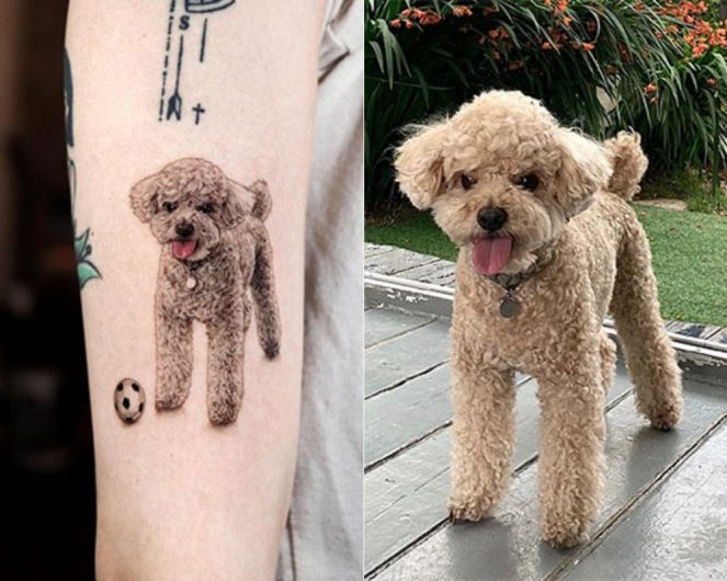 This poodle tattoo really captures the dog’s playful vibe! The eyes and fluffy fur make it look so real, like the dog could jump out at any moment. The little red ball adds a nice touch, reminding you of all the fun times spent together.