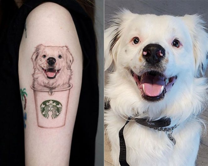 This tattoo of a fluffy dog peeking out of a Starbucks cup is adorable. The details in the fur and the dog’s happy expression make it feel full of energy and joy.