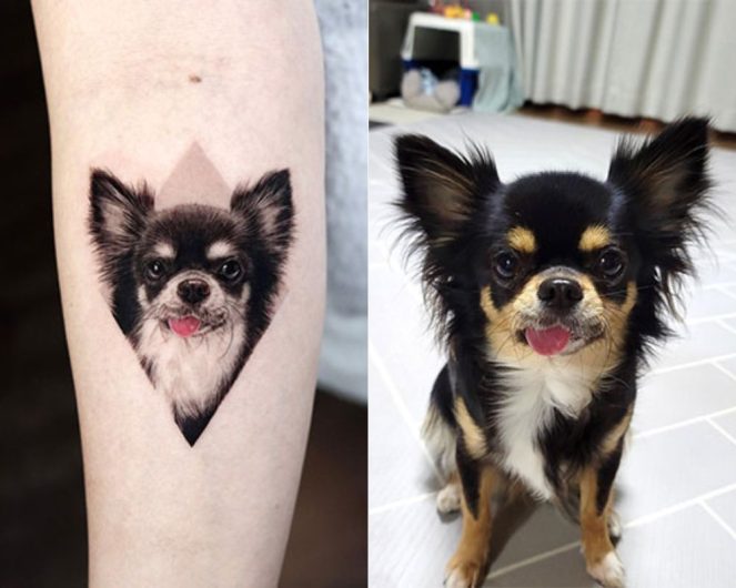 This cute Chihuahua tattoo perfectly captures the dog’s lively personality. With big sparkling eyes and a tiny tongue, it feels like the pup could jump out at any moment. The minimalist background helps keep the focus on its expressive face.