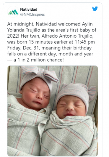 “Her twin, Alfredo Antonio Trujillo, was born 15 minutes earlier at 11:45 pm Friday, December 31, meaning their birthday falls on a different day, month, and year — a 1 in 2 million chance!”