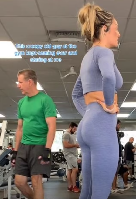 A woman confronts a creepy older man at the gym who refuses to stop staring at her, despite her husband’s attempts to block his view.