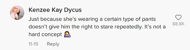 ‘Just because she’s wearing a certain type of pants doesn’t give him the right to stare repeatedly. It’s not a hard concept,’ one person wrote.