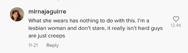 Another added: ‘What she wears has nothing to do with this. I’m a lesbian woman and don’t stare. It really isn’t hard. Guys are just creeps.’