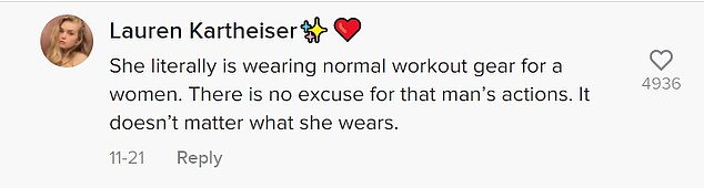 ‘She [is] literally wearing normal workout gear for a [woman]. There is no excuse for that man’s actions. It doesn’t matter what she wears,’ someone else insisted.