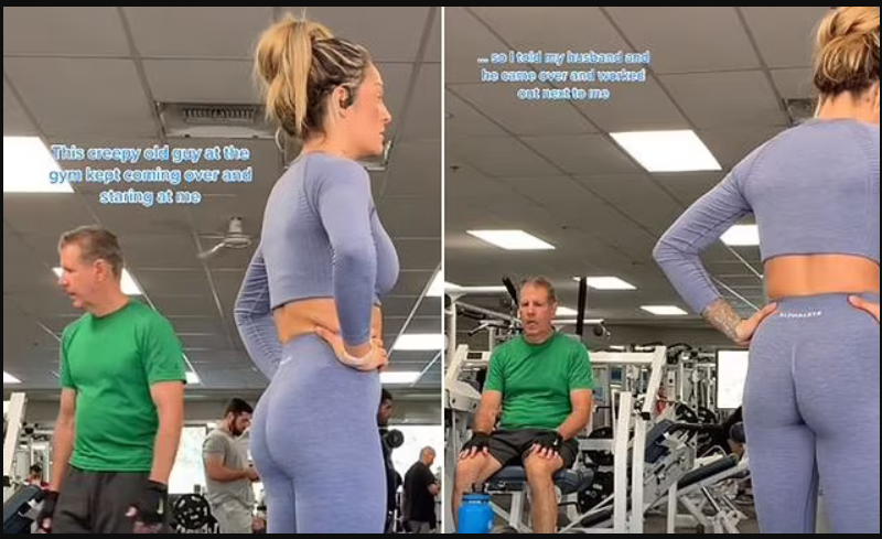 A woman confronts a creepy older man at the gym who refuses to stop staring at her, despite her husband’s attempts to block his view.