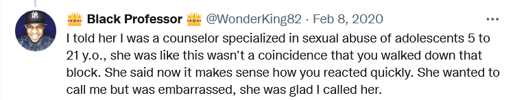 Until she saw our hero, saw the inviting smile on his face and her instincts told her to hug him and ask for help. He walked her home, making sure she was safe, and the group of three men couldn’t do anything.