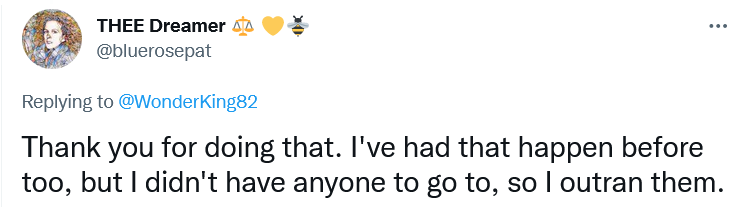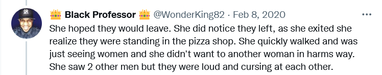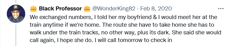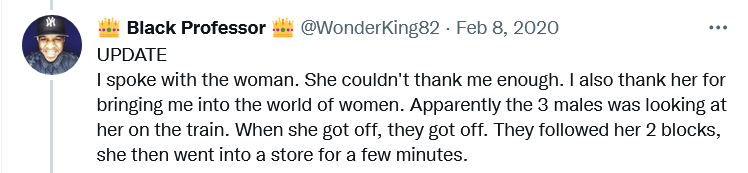 We are truly grateful for this heroic human being for being there. This woman was all alone, followed by a group of three men who kept following her throughout her journey. She even tried to stop at a store, and they went with her.