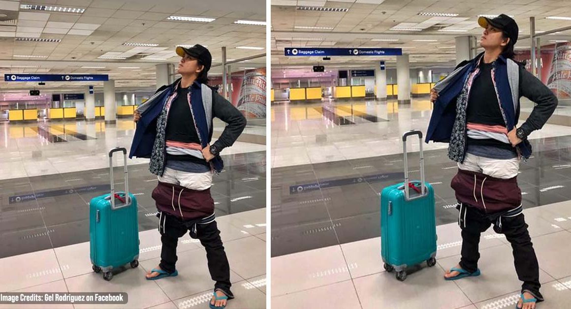 Gel Rodriguez from Davao, Philippines, decided to wear as many of her clothes as possible, which saved her from paying extra baggage fees.