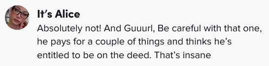 “He wants me to add him to the title since he will be paying for stuff around the house.”