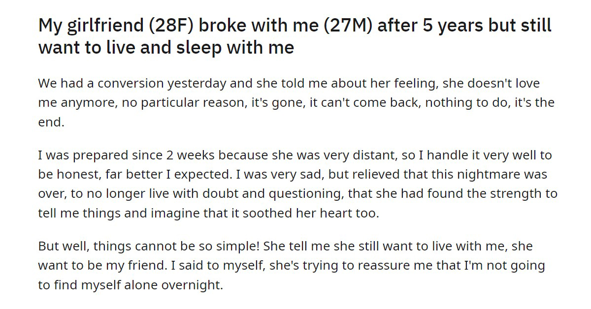 My girlfriend broke up with me after five years but still wants to live and sleep with me