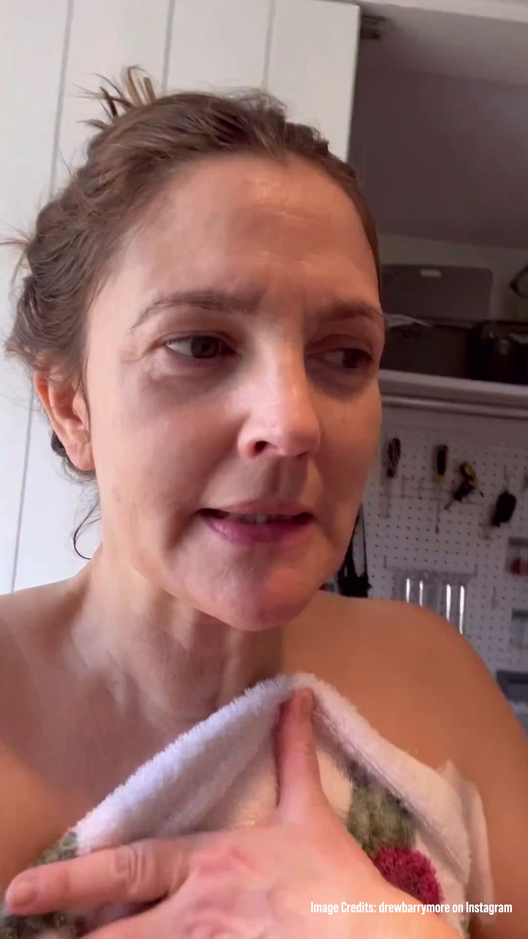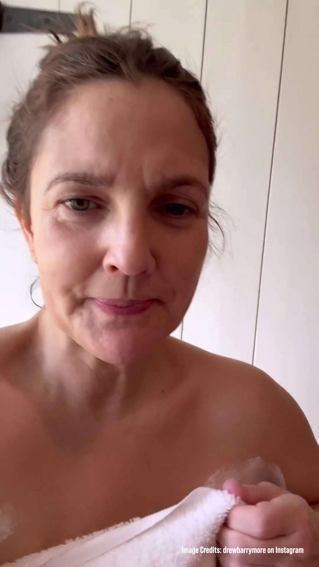 The clip showed Drew, 48, wearing a towel with remains of shaving cream beneath her armpits as she spoke to the camera.