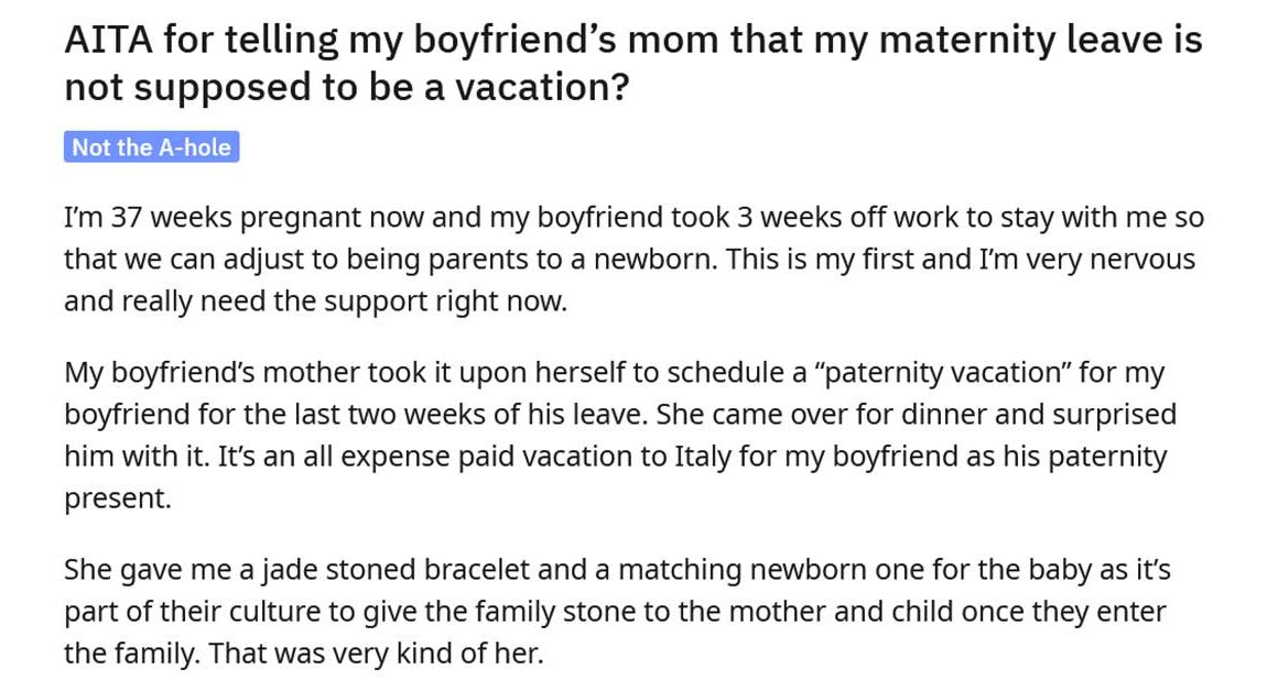 “My boyfriend’s mother took it upon herself to schedule a “paternity vacation” for my boyfriend for the last two weeks of his leave. She came over for dinner and surprised him with it. It’s an all expense paid vacation to Italy for my boyfriend as his paternity present.”