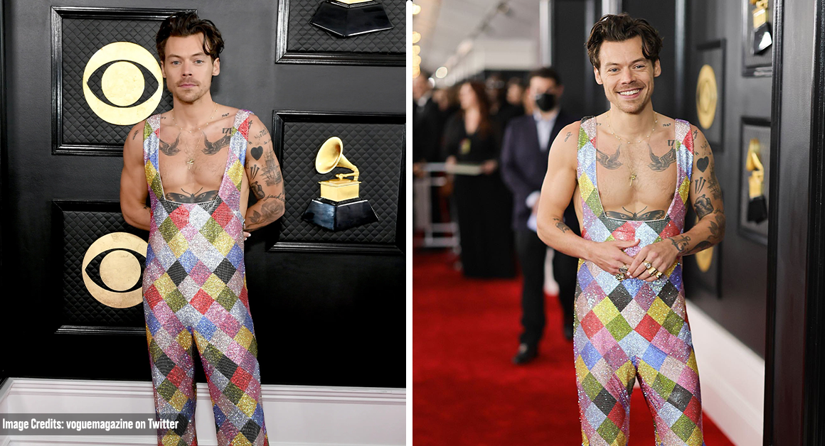 According to a statement by Vogue Magazine, “Though he’s worn many jumpsuits over the years, from striped JW Anderson to bedazzled Gucci styles, this latest version tonight has a decidedly more Harlequin vibe. Since the fabric was made with Swarovski crystals, it needed minimal accessorizing.”