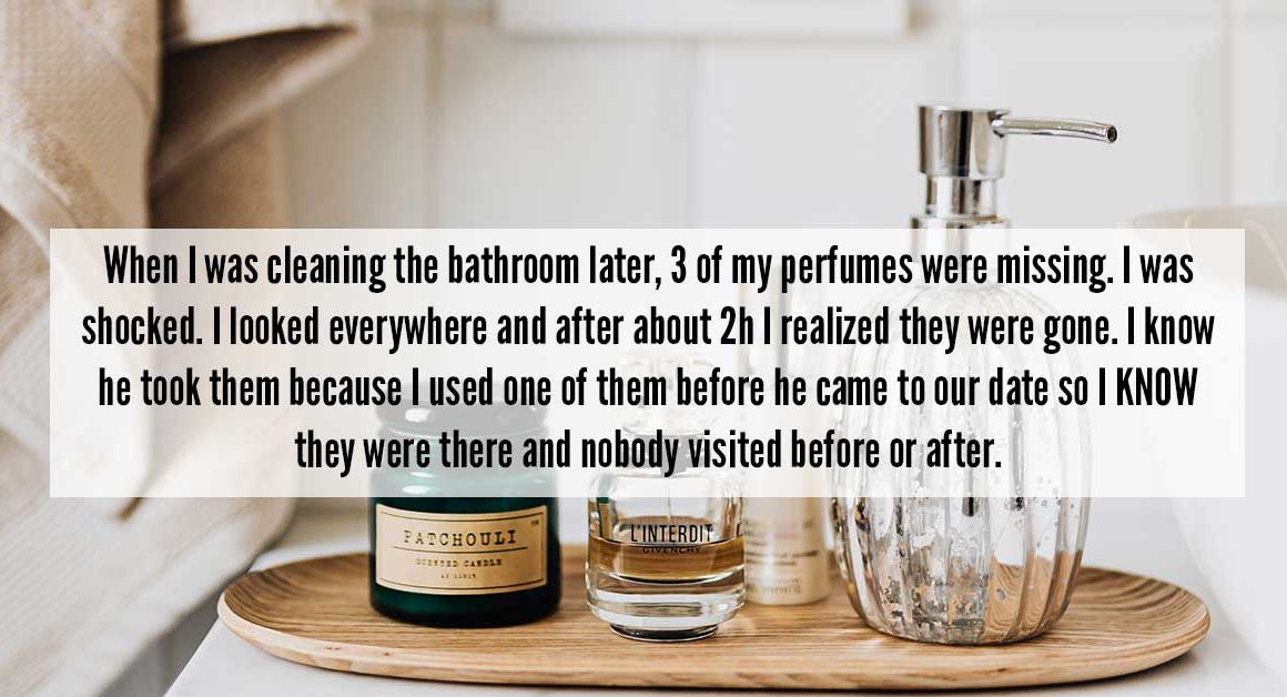 When I was cleaning the bathroom later, 3 of my perfumes were missing. I was shocked. I looked everywhere and after about 2h I realized they were gone. I know he took them because I used one of them before he came to our date so I KNOW they were there and nobody visited before or after.
