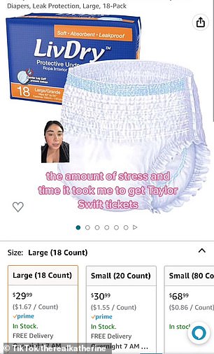 Katherine posted a screenshot of the Amazon listing for a pack of LivDry adult diapers and wrote, “The amount of stress and time it took me to get Taylor Swift tickets, I will be getting an adult diaper because I am not missing a minute of it.”