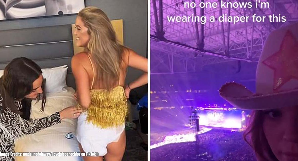 One TikToker @madelinedolaway shared a video on her account on May 18 that showed her and her friends getting ready for the concert, and one of her group members helped her strapping the diaper underneath her gold tasseled dress.