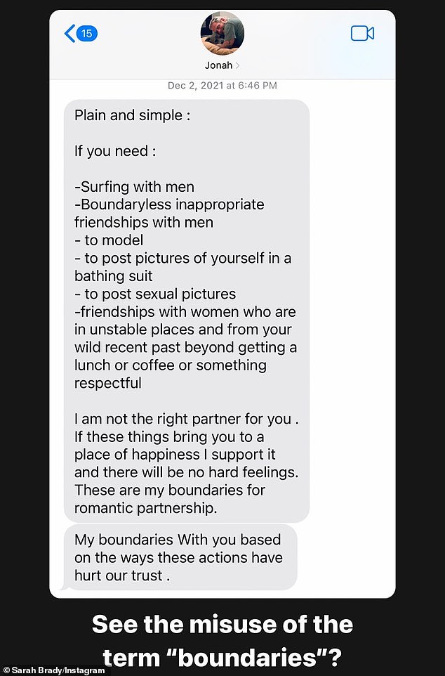 She posted another screenshot in which Hill, 39, sent her a list of things he was not okay with, including Brady surfing with men, posting sexual pictures, having no boundaries in her friendships with men, posting pictures of herself in a swimsuit, and friendships with women who are in unstable places.