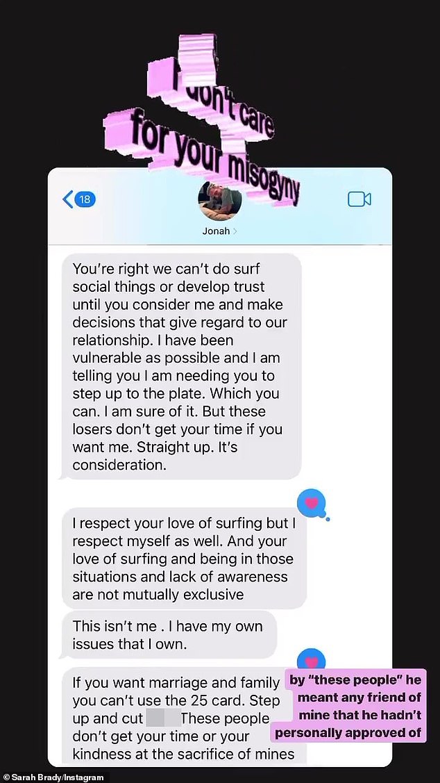 “This is a warning to all girls. If your partner is talking to you like this, make an exit plan. Call me if you need an ear,” Sarah wrote, alongside a screenshot of messages from Jonah in which the comedian asked her to take down photos from her Instagram in which she wore a thong.