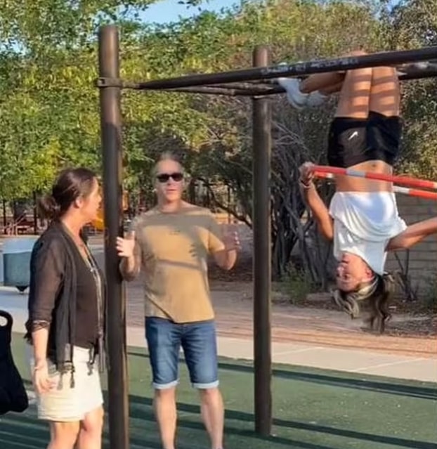 Getti was practicing her skills on monkey bars upside down.