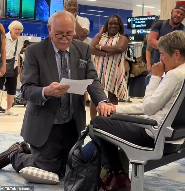 When she landed at the Tampa airport in Florida, Nancy was stunned to see Thomas sitting on one knee, all set to propose to the long-lost love of his life.