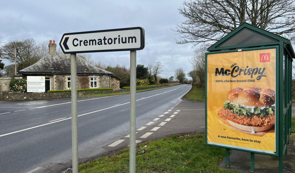 As reported by CornwallLive, “The sign, advertising the fast food chain’s McCrispy burger, is right next to a crematorium sign and has been placed on a bus stop directly opposite Penmount Crematorium on the road between Truro and Carland Cross.”