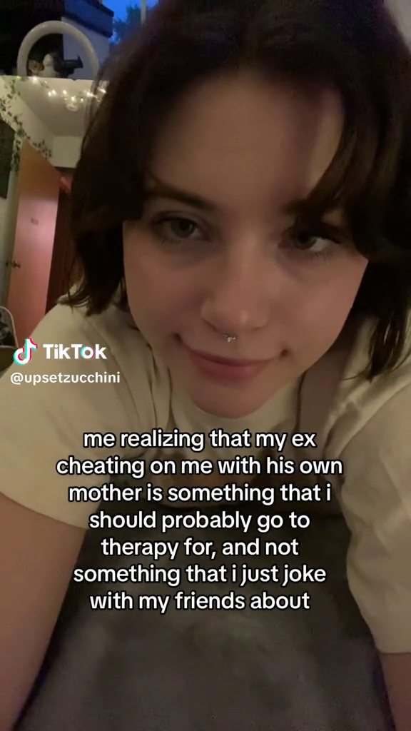 “me realizing that my ex cheating on me with his own mother is something that I should go to therapy for, and not something that I just joke with my friends about,” the text on her video read.