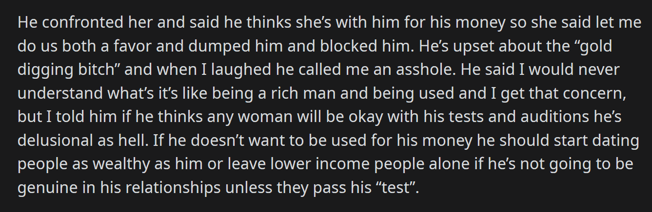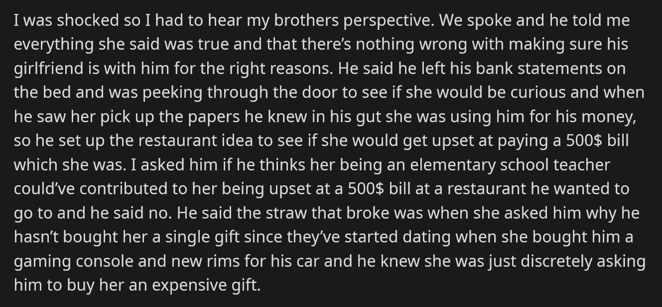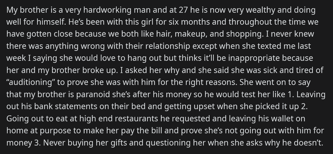 A question was posted on Reddit’s AITA (Am I The A** Hole?) subreddit by a user who had recently scolded her brother. She wanted to ask the community if she did the right thing or went too far. The story revolves around her brother “testing” his girlfriend to see if she was a gold-digger. The post goes as follows: