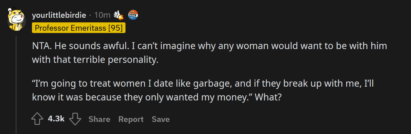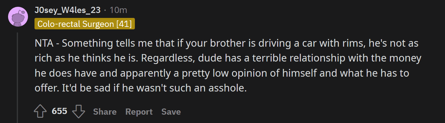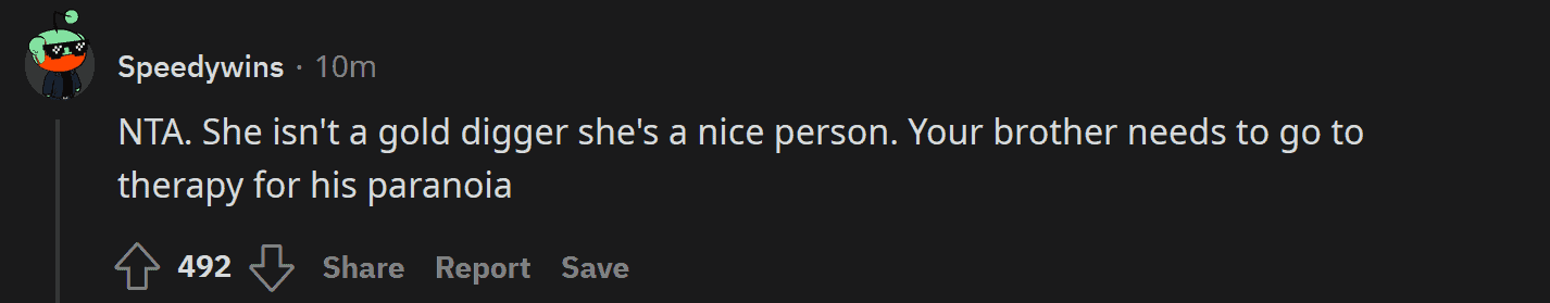 Everyone came to her side, telling her she did the right thing by scolding her brother. By being honest with her brother, maybe she can make him realize the error of his ways. Here are some of the responses on the post (NTA means Not the A** Hole):