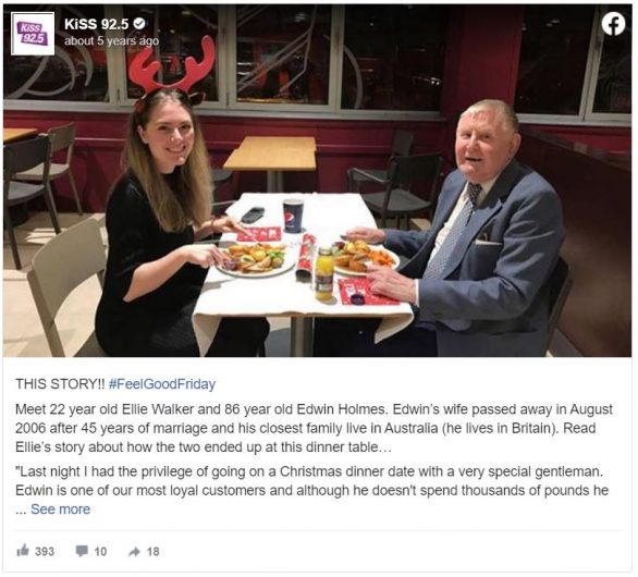Some stories are so incredible and beautiful; they’re worth sharing. This one comes from 2017 – where a 22-year-old woman asked an 86 year old widower to a dinner date for Christmas so that he’s not alone.