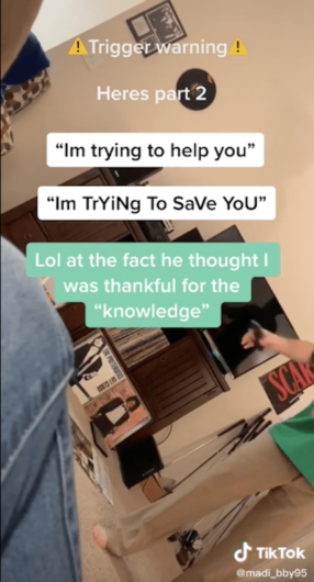 Madison challenges his toxic masculinity, and he tries to tell her that what he is doing is imparting great wisdom and knowledge to “protect” her. During her follow-up video, she says he tried to remain calm while she sat down.