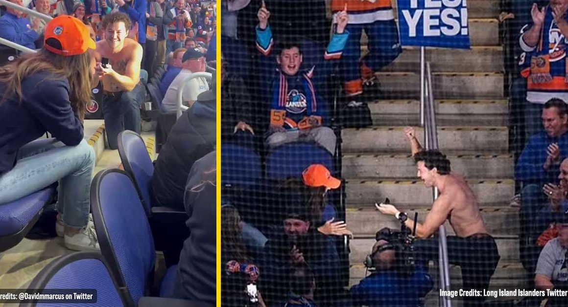A shirtless man tried to propose to his girlfriend at the Islanders VS. Panthers hockey match and met with cruel rejection!