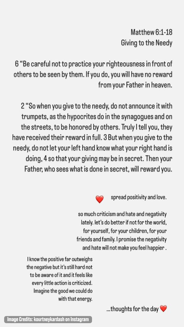 “So much criticism and hate and negativity lately,” Kourtney wrote. “Let’s do better if not for the world, for yourself, for your children, for your friends and family. I promise the negativity and hate will not make you feel happier.”