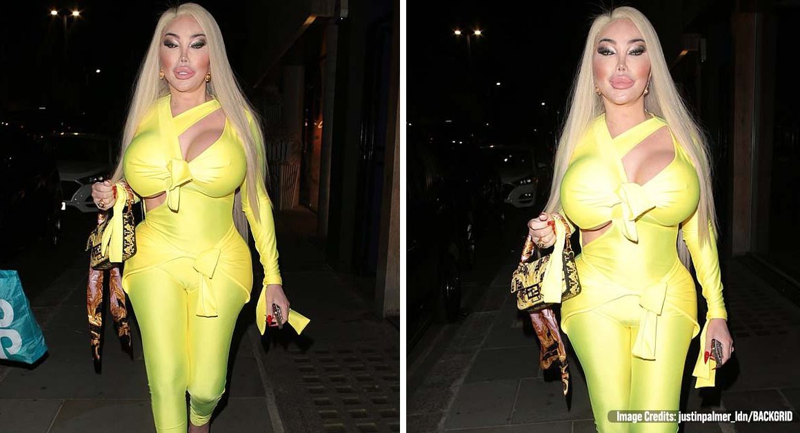 The 39-year-old Brazilian-British TV personality who recently got done her third boob job boasted her new body in a skin-tight yellow jumpsuit.