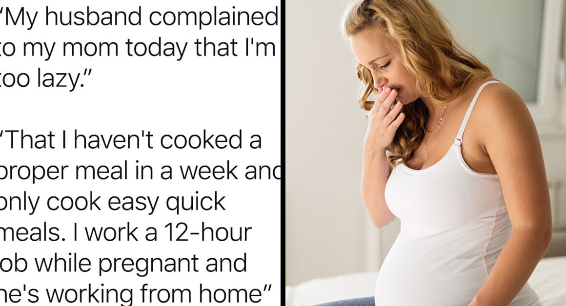 “My husband complained to my mom today that I’m too lazy. That I haven’t cooked a proper meal in a week and I only cook easy quick meals. I’m working a 12 hour job while pregnant and he’s working from home. My job is also a 2hour drive from the house. I’m away 14 hours a day overworking myself while he does nothing to help around the house and the few times he does help he rubs it on my face while calling me lazy and complaining to my mom and his mom.”