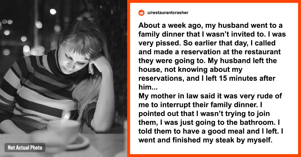 “About a week ago, my husband went to a family dinner that I wasn’t invited to. I was very pissed. So earlier that day, I called and made a reservation at the restaurant they were going to. My husband left the house, not knowing about my reservations, and I left 15 minutes after him.”
