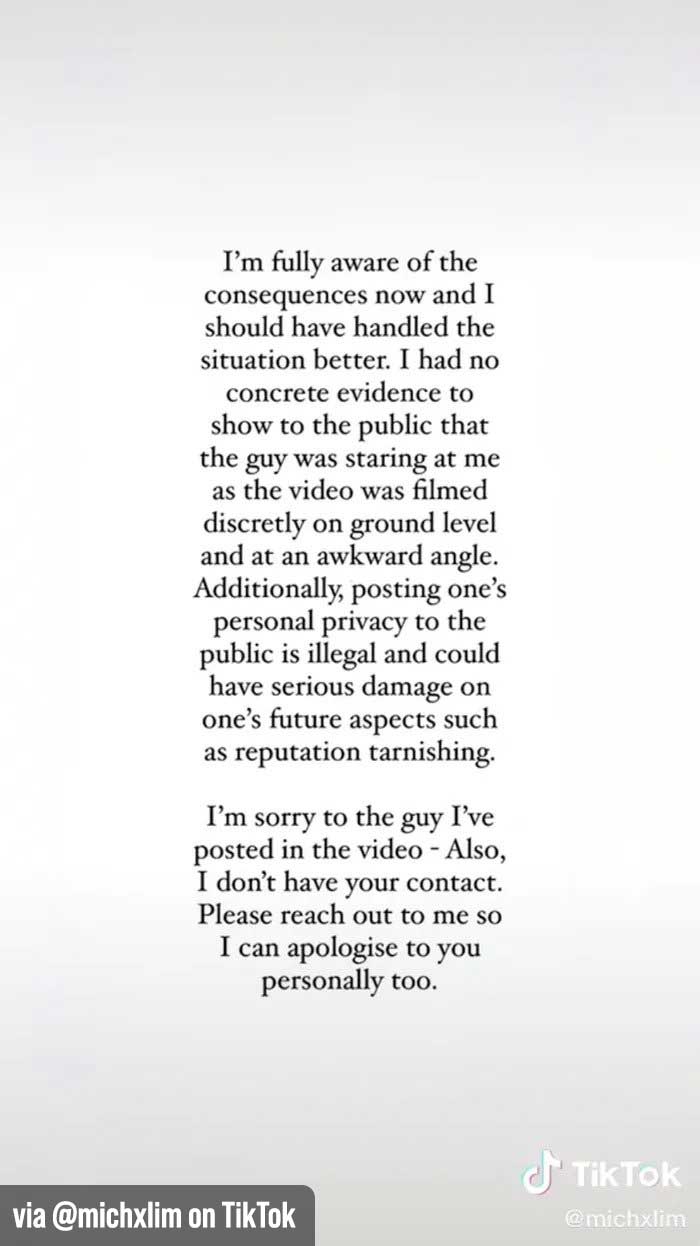 In her video note, she tried to reach out to the “man in the white shirt” to personally apologize to him for any distress this might’ve caused him. Her account has since been deleted.