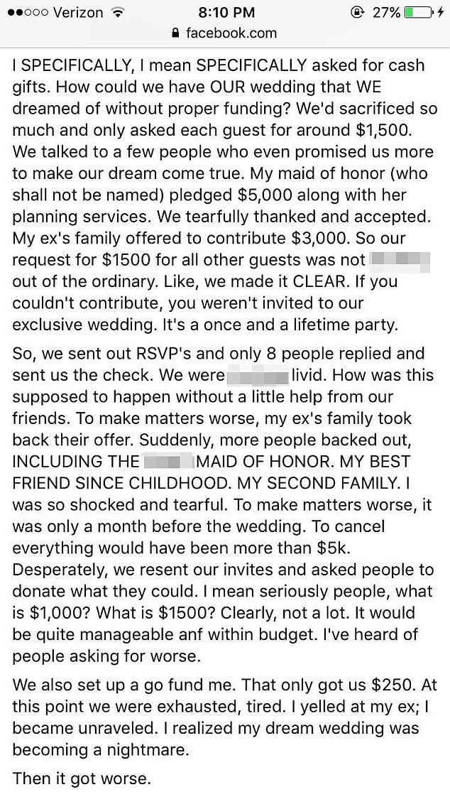 “I specifically, I mean specifically asked for cash gifts. How could we have our wedding that we dreamed of without proper funding?” she said. “We’d sacrificed so much and only asked each guest for around $1,500. We talked to a few people who even promised us more to make our dream come true.”