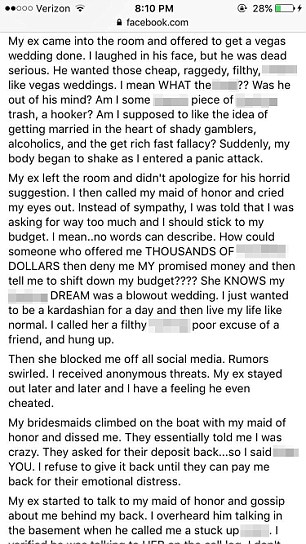 “How could someone who offered me thousands of dollars then deny me my promised money and then tell me to shift down my budget? She knows my f***ing dream was a blowout wedding.”